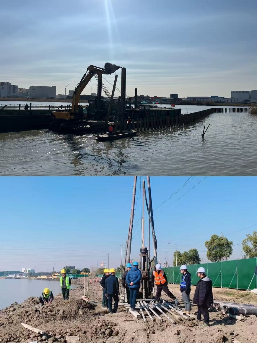 【概要描述】2月13日,在扬州水利建筑程有限责任ag(中国)承建的吴淞江(江苏段)整治工程(昆山市)施工八标建设现场机械轰鸣、车辆穿梭,工人们分工合作、干劲十足,现场一片繁忙。 项目部在春节放假前抢抓时间完成了水泥搅拌桩、管桩、灌注桩试桩,充分利用假期时间提高强度以满足检测要求。2月9日管理人员到岗后,实时调整进度计划,精心组织各专业施工班组到位,将3公里施工区域划分为9个工区,护岸桩基目前进入全面铺开施工阶段,水
